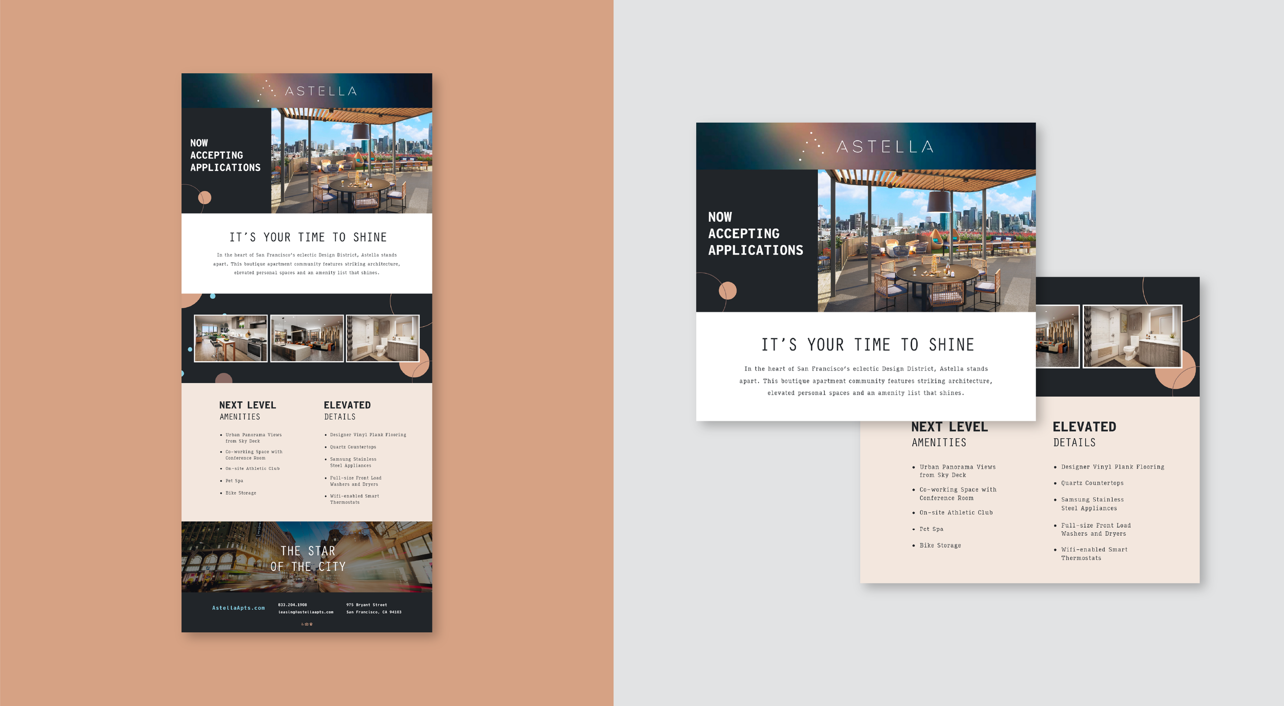Geofencing is a location-based tool that allows communities like Astella to connect with smartphone users through targeted messages when they enter a specific area. To support this strategy, Astella needed branded ads and a custom email template that highlights the community’s unique amenities and features, offering a clear, concise snapshot of what makes it stand out.